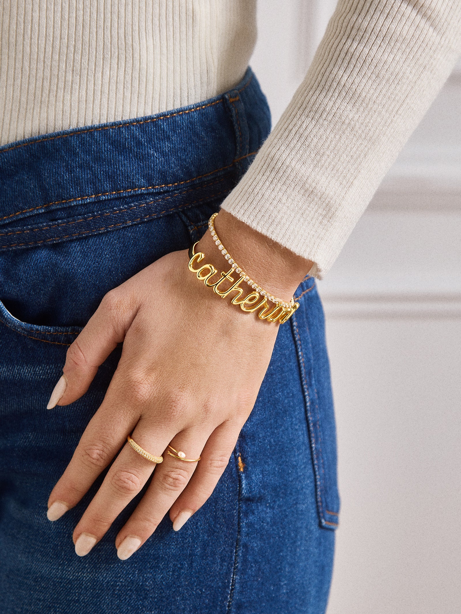 This classic cuff gets a modern update in our script font. Type out any personalization you please and your customization will appear in a pretty script font. The nameplate sits on an adjustable gold cuff. Please note: your customization will appear in all lowercase letters.