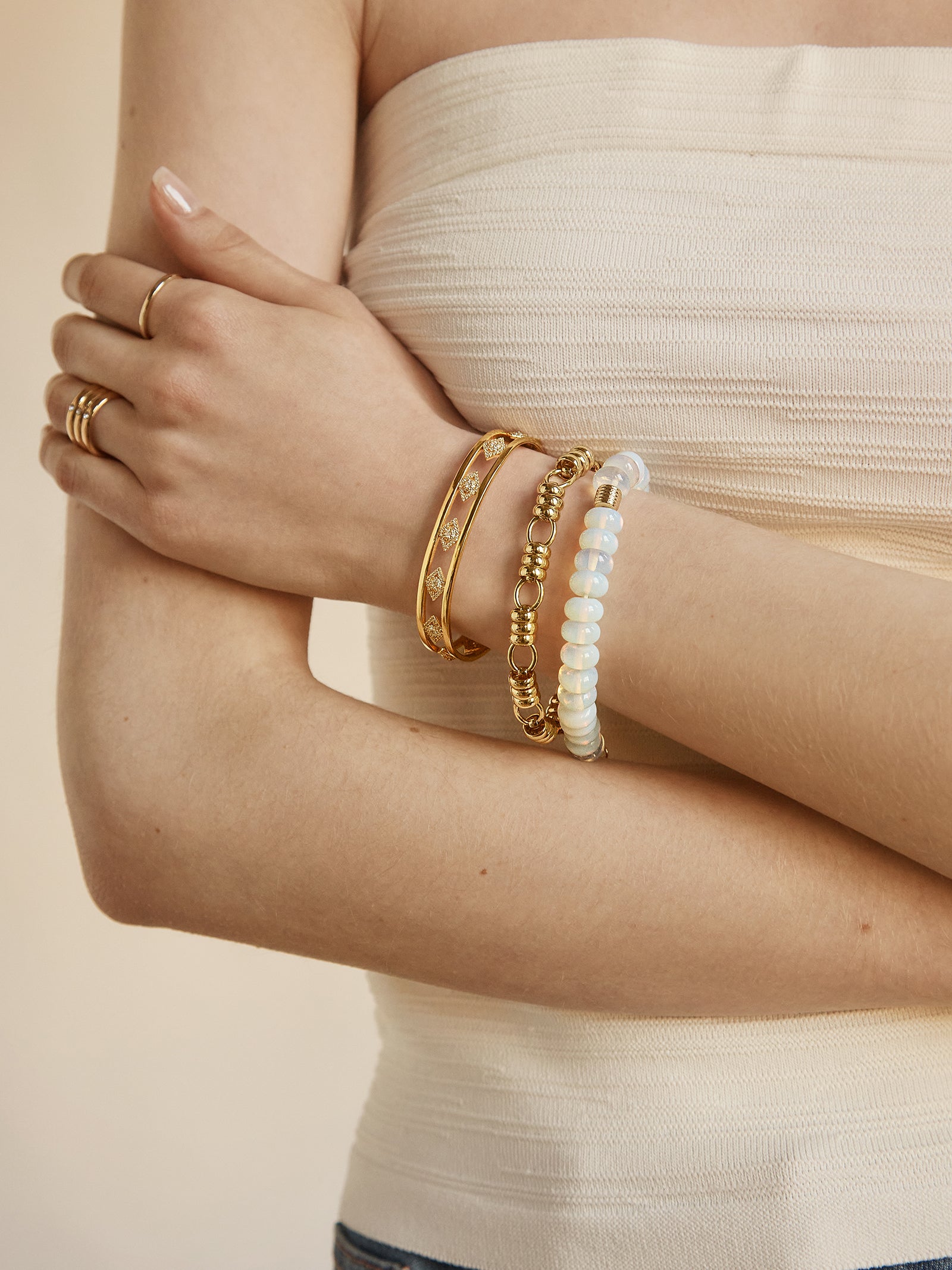 Protect your energy with the sleek 18K Gold Evil Eye Cuff Bracelet. Featuring repeating pav?? evil eyes. this cuff adds a modern twist to your wrist stack while offering sentimental meaning. Crafted with 18K Gold and cubic zirconia stones. it’s a timeless piece that’ll always add good vibes.
