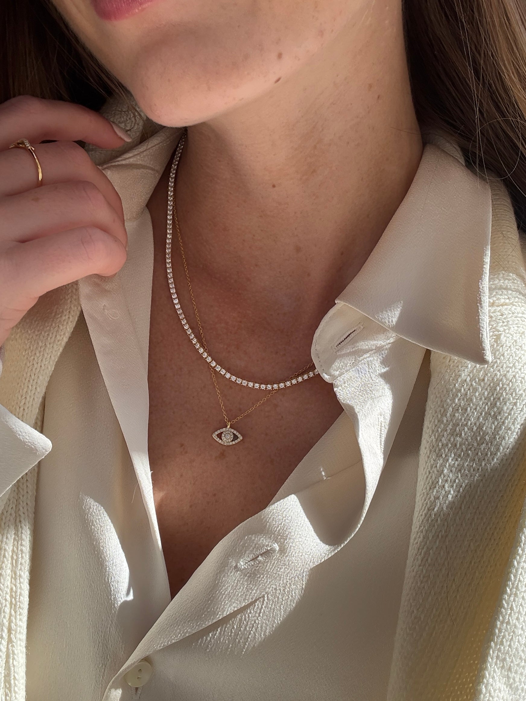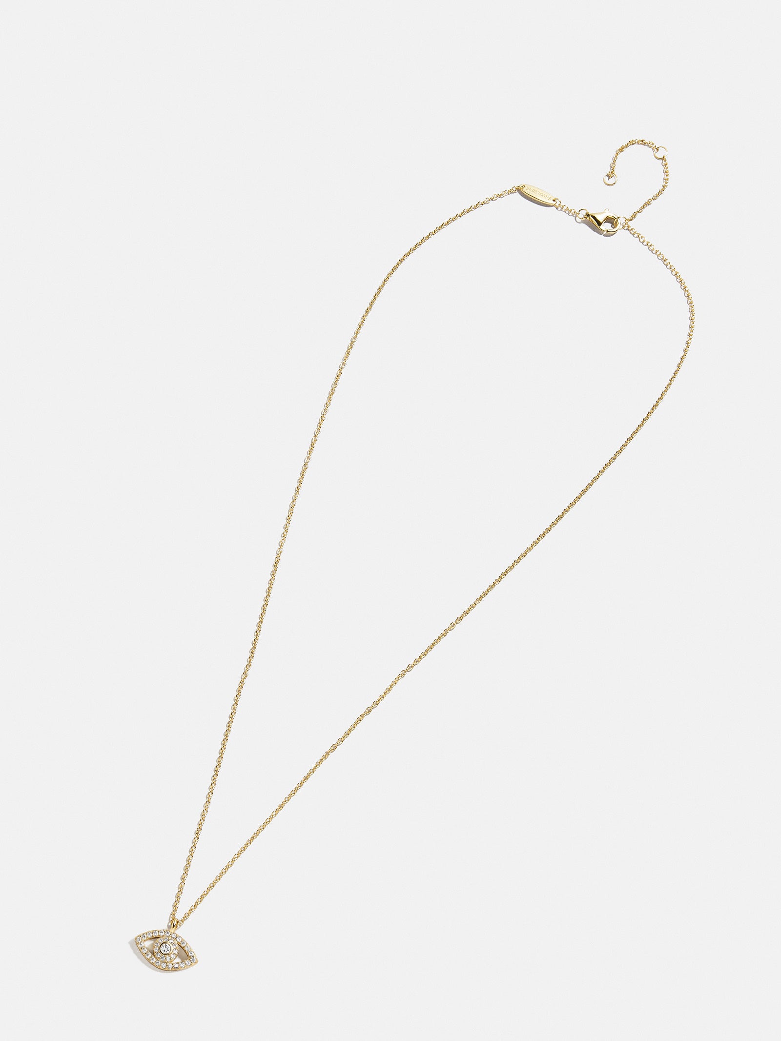 Keep the good vibes going with the 18K Gold Motif Necklace. Dainty and delicate. this necklace features a pav?? evil eye to protect against negativity. Crafted with 18K Gold and cubic zirconia stones. this necklace will last for years of positivity.
