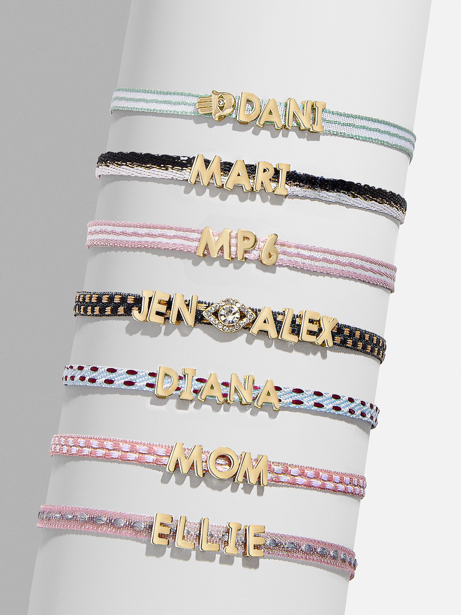 Add a personal touch to your wrist stack with the Custom Ribbon Bracelet. With an assortment of gold or sparkling pav?? letters and symbols to choose from. mix and match up to 12 charms to best fit your vibe. Your hand-picked letters or symbols will be strung onto a comfortable and adjustable pull-tie ribbon in the color of your choice. to give you an everyday signature statement. Beads are designed to slide and move with you. offering comfort and flexibility.