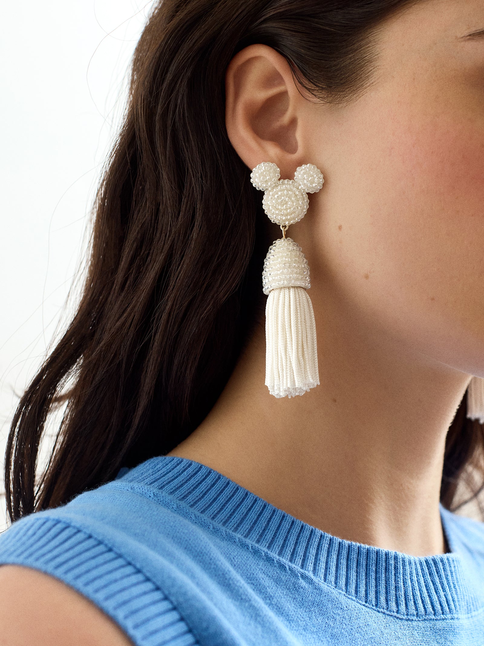 Level up your looks with the Disney Mickey Mouse Tassel Earrings. A true statement piece. these earrings feature Mickey’s head. elegantly beaded. with threaded tassels cascading below. Wear them with white for a monochrome look. or use them to elevate basic jeans and a tee.