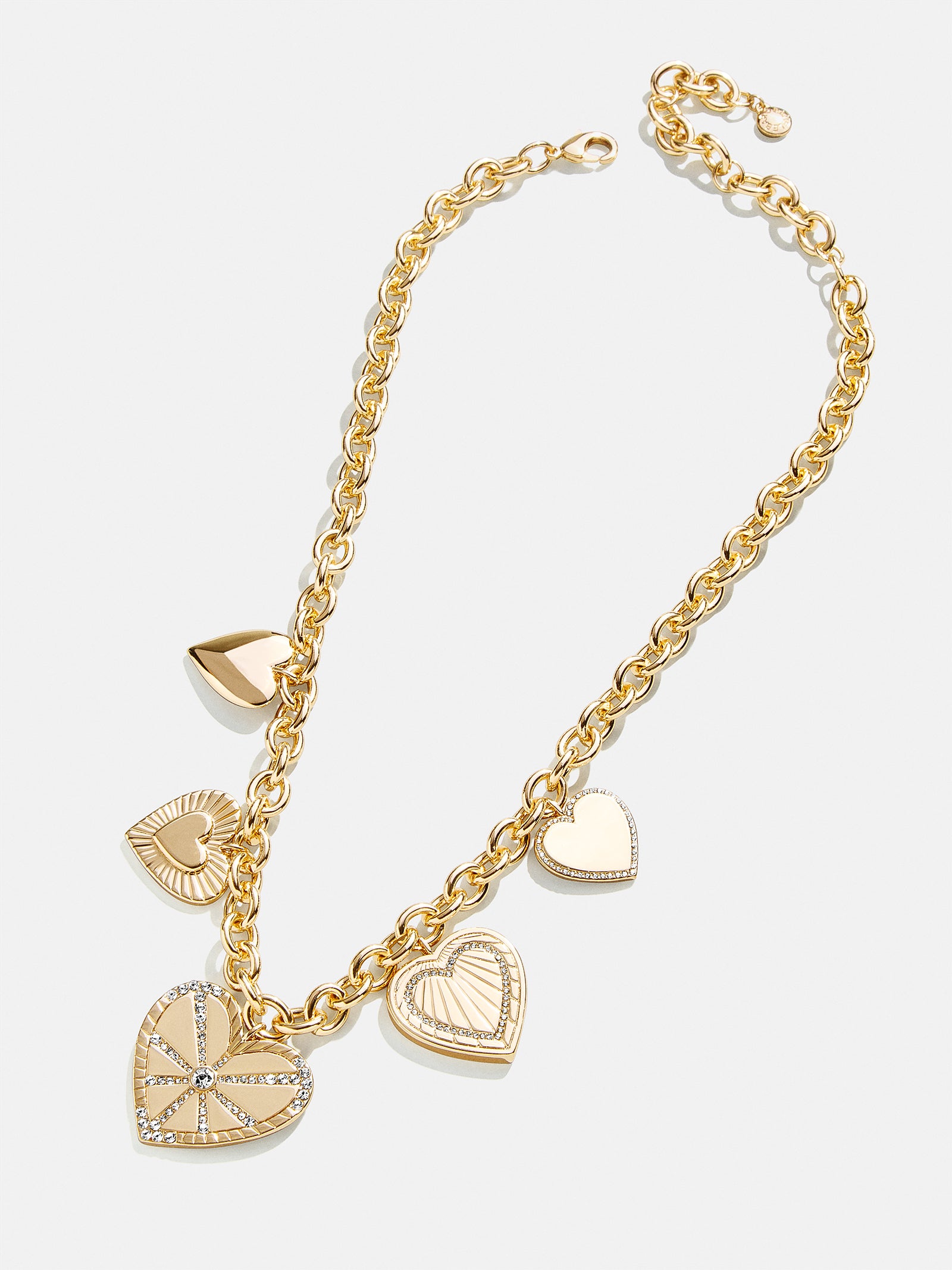 Amp up any outfit with the necklace that speaks volumes. Oversized and cool. the Heartburst Statement Charm Necklace features large heart charms that blend vintage-inspired fashions with a modern edge. Pair with simplistic earrings to create a bold look that stands out.