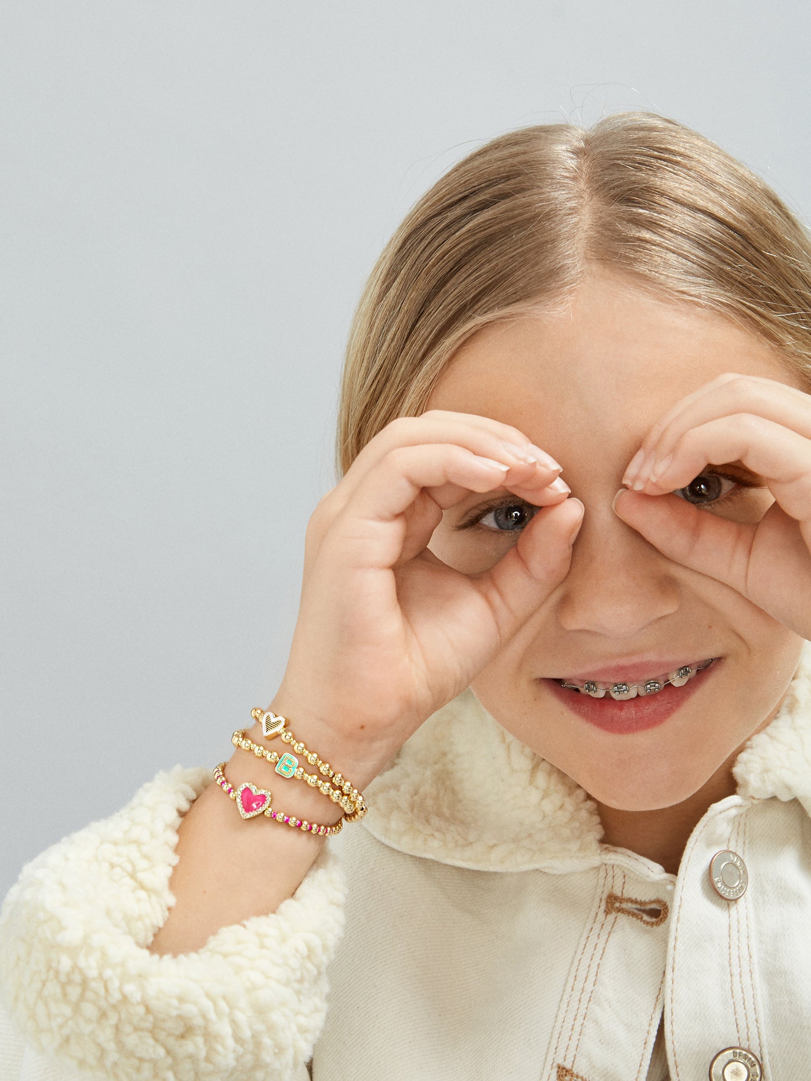 Give your mini the best of both worlds when you scoop up this two-in-one. super stackable bracelet set. The Initial & Heart Kids’ Pisa Bracelet Set will feature the initial of your choosing crafted in vibrant enamel and flanked by gold ball beads. We paired each initial with a white enamel heart bracelet. ensuring your little’s bracelet stack will be extra meaningful.