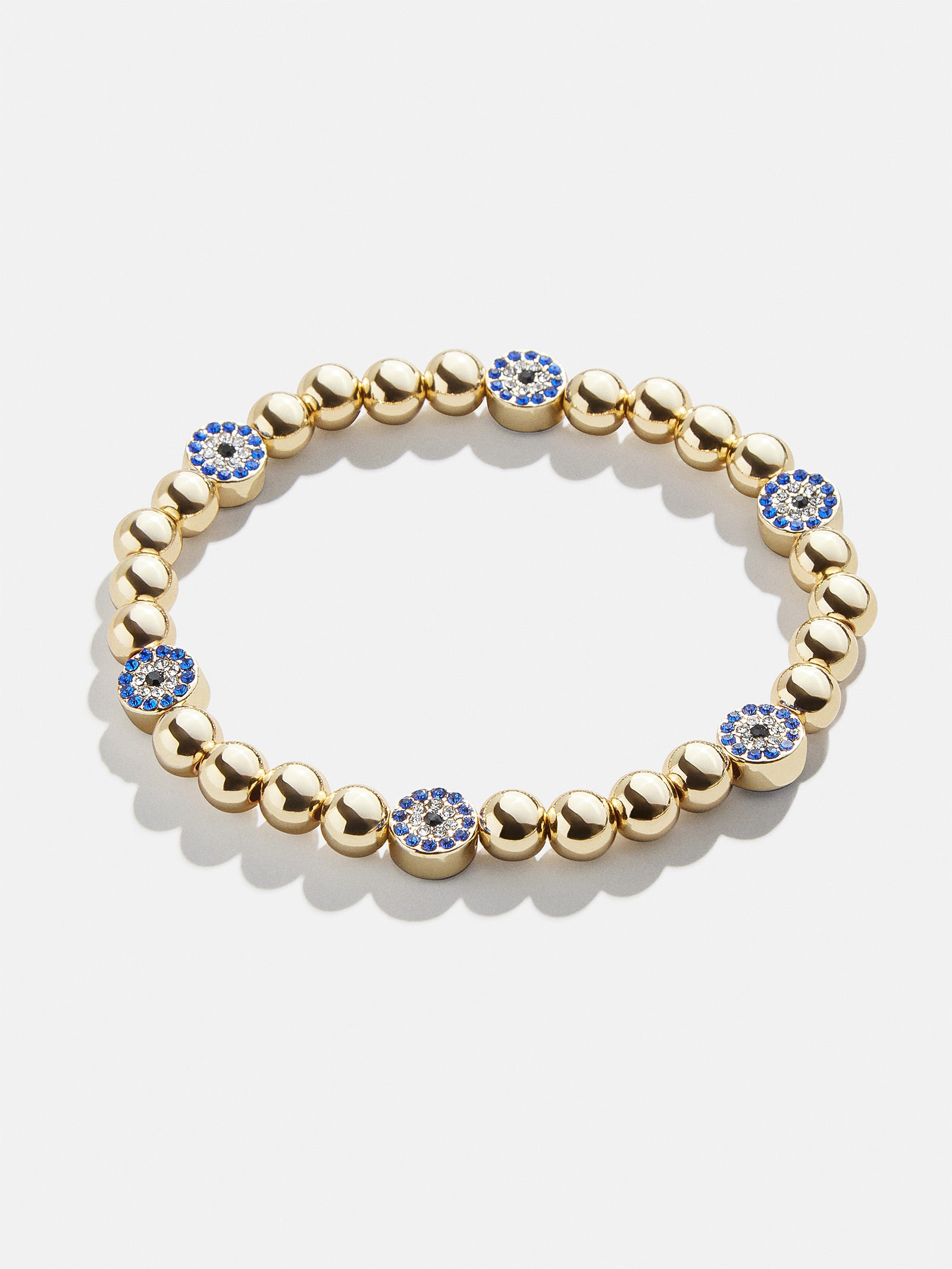 Embellish your energy with this evil eye accessory. The Isabella Bracelet shines with gold beads and royal blue evil eye pav?? stones. Plus. it stretches and adjusts to fit anywhere on your wrist ?? or any of your friend’s. This bracelet features 6mm gold ball beads.
