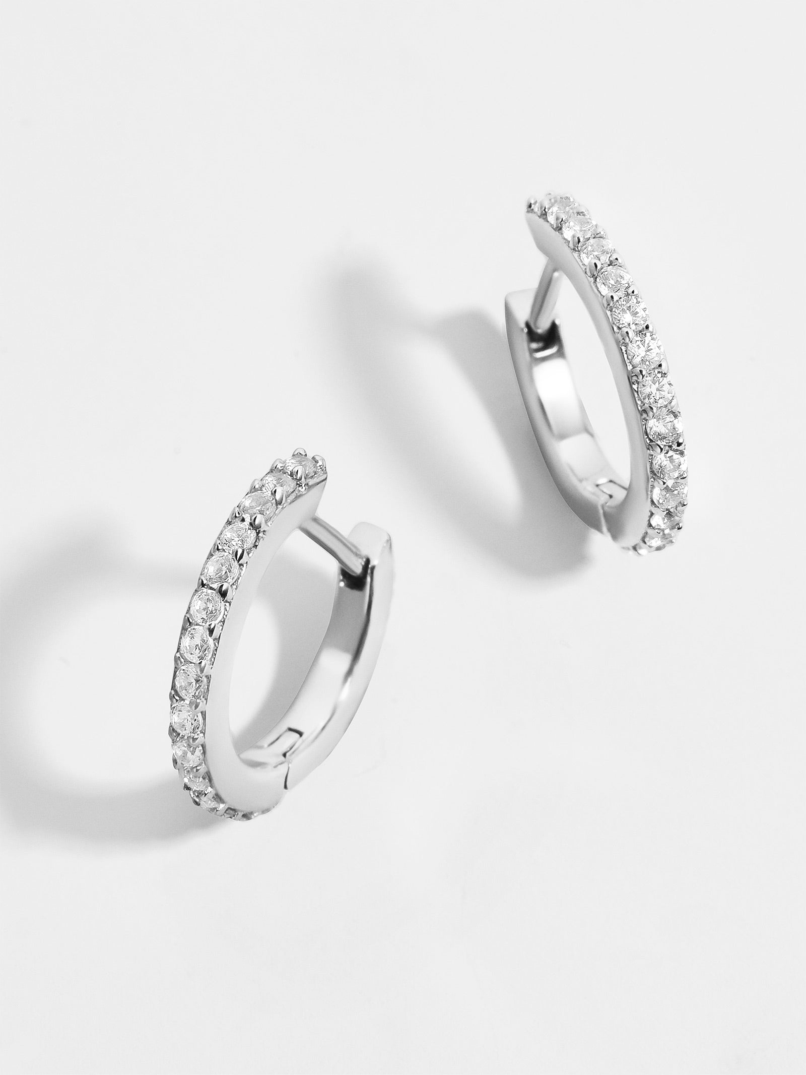 A downsized pair of pav?? huggie hoops are a must-have for any jewelry lover. The perfect size for building the on-trend layered ear look. this pairing is crafted with your choice of either sterling silver or 18K Gold. meaning they’ll last you for a lifetime. Better yet. they feature luxe Cubic Zirconia stones. Layer a few or let just one pair stun all on its own.