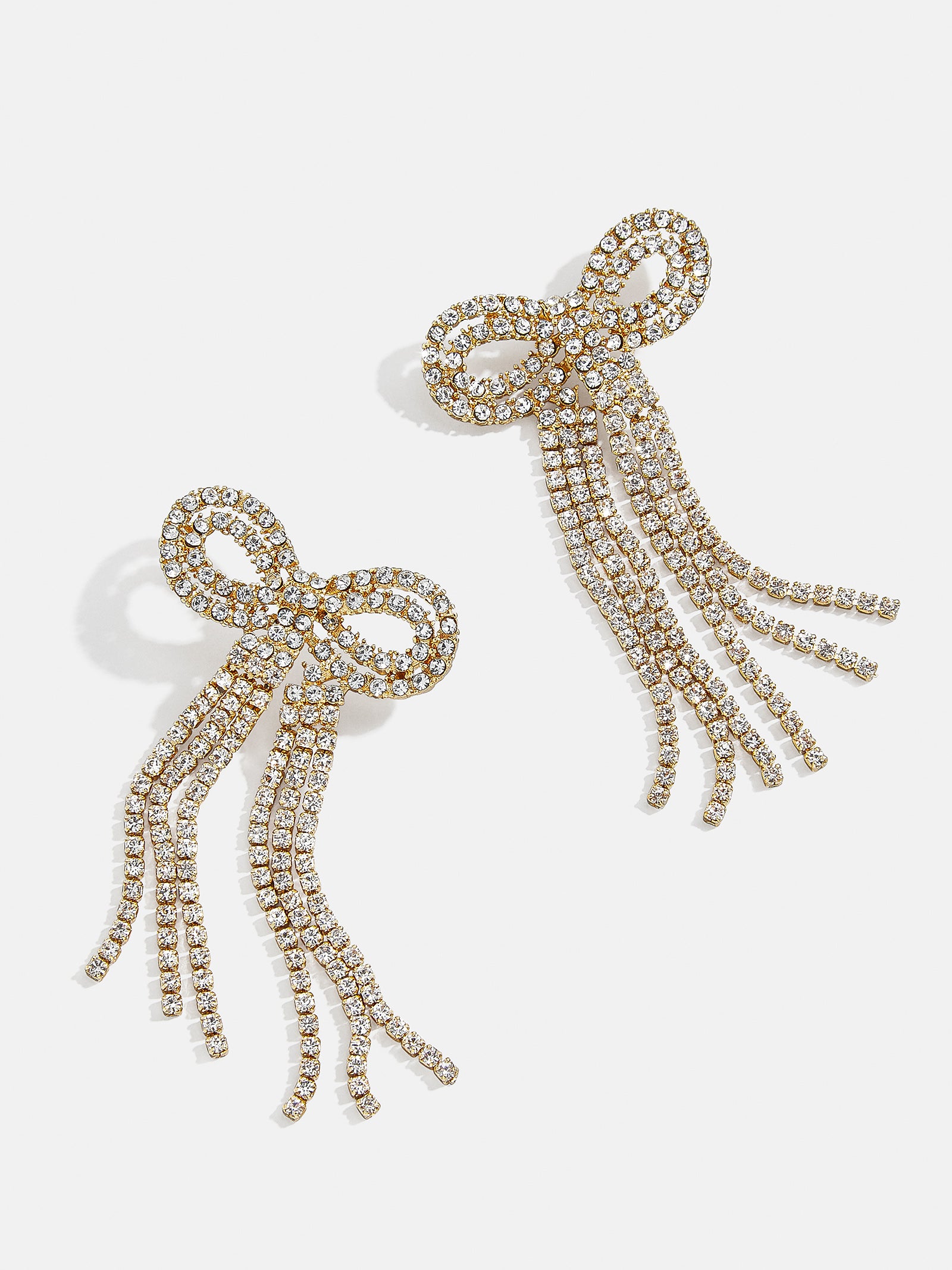 Add something on-trend to your accessory arsenal with the Nicci Earrings. Glass stone encrusted statement studs in the shape of a bow attach to on-trend crystal fringe. Offering fun movement and feminine details. we know you’ll reach for these sparklers again and again.