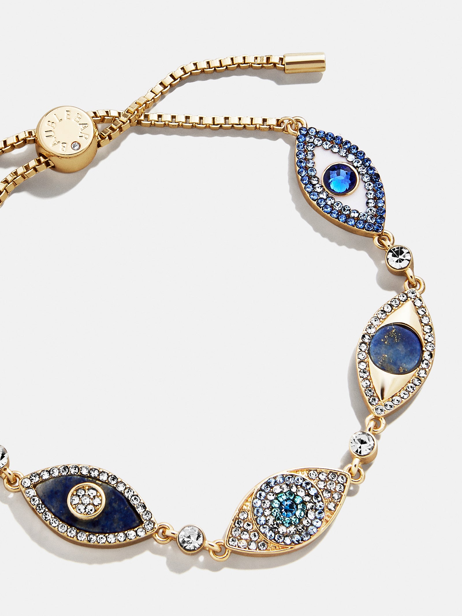 Ward off bad vibes with the Eyes On Eyes Bracelet. This pull-tie bracelet features repeating pisa beads in varying shades of blue. black and sparkling pav??. It’s effortlessly chic for everyday wear ?? whether you style it solo or use it to create a meaningful wrist stack.