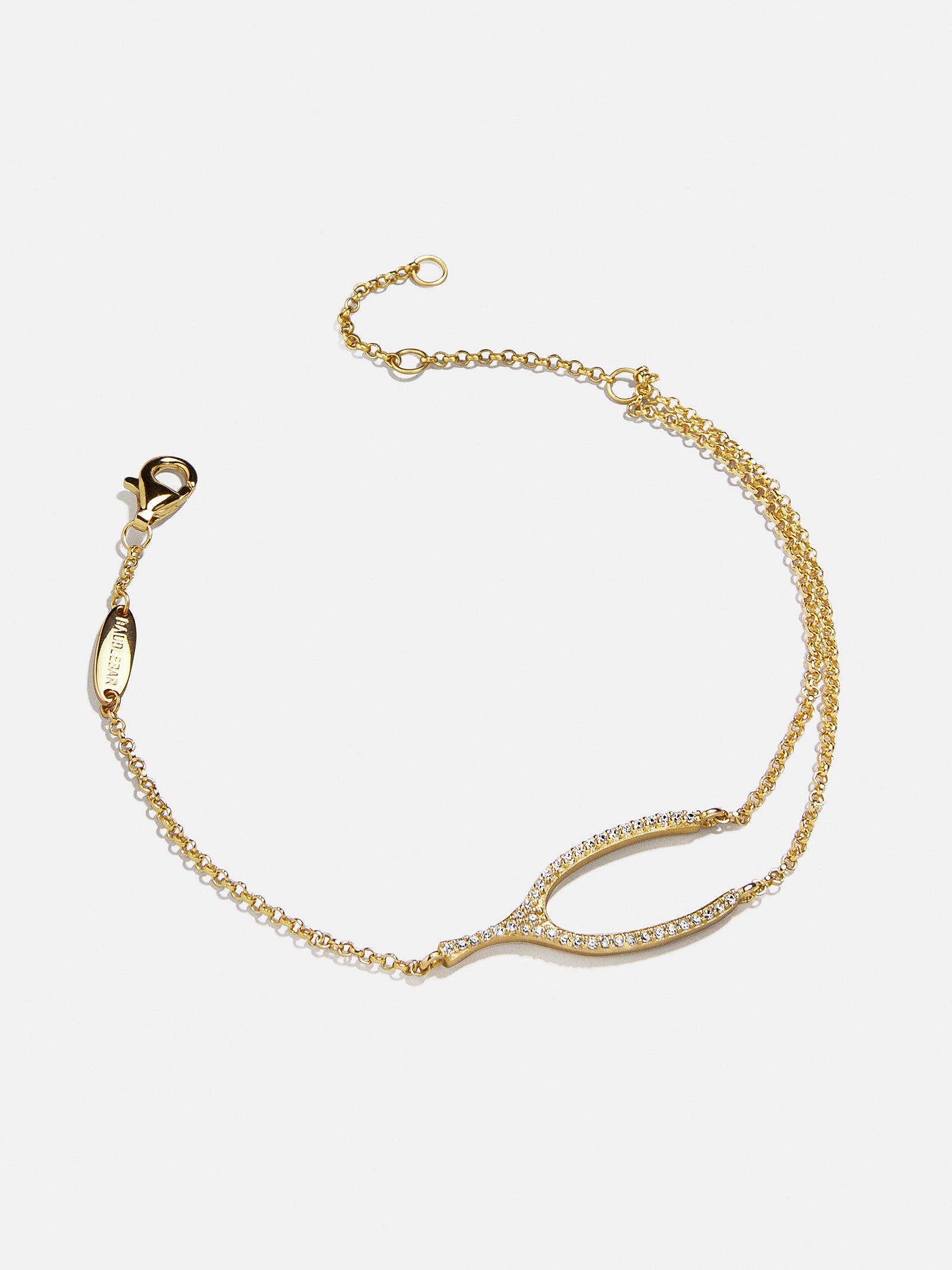 Stay lucky in the chicest fashion. Featuring a delicate pav?? wishbone on a dainty gold chain. this bracelet adds just the right touch of sparkle and meaning to your wrist stack. Crafted from 18K Gold and cubic zirconia stones. it’s designed for everyday elegance and timeless wear.
