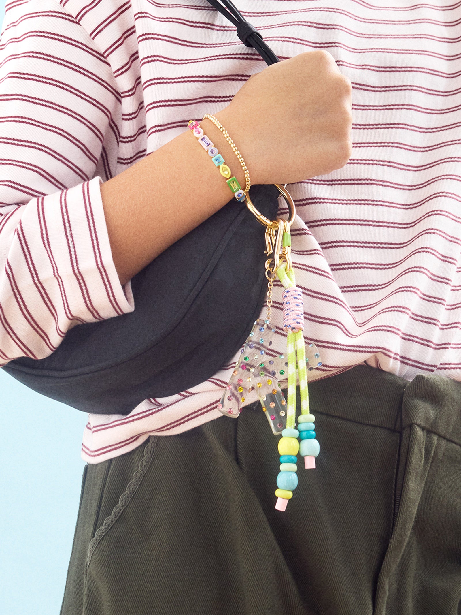 Add a pop of color and personality to your bag with the Zoe Beaded Bag Charm. Featuring a bold green rope and a mix of vibrant blue. green. and soft pink beads. this charm turns any bag into an instant statement piece. Its playful design and chic details make it a perfect accessory for brightening up your everyday style.